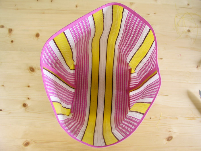 La rafia de plástico es un material muy agradecido. Con cuatro costuras la bolsa ya se queda de pie sola, dándonos una idea muy aproximada de cómo nos quedará al final.