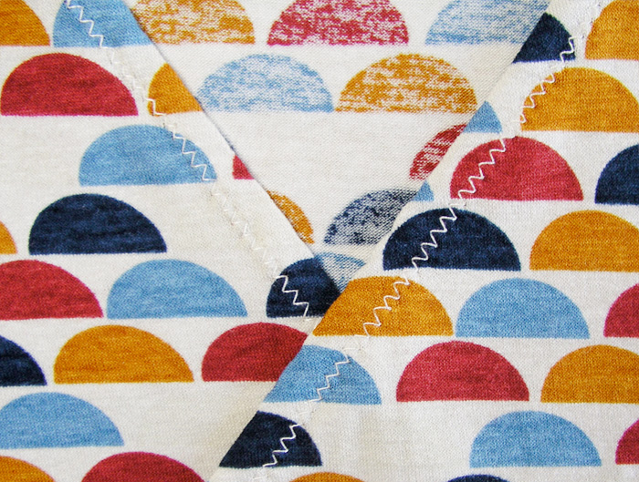 Este es el aspecto del pulido del escote por la parte interior de la prenda: zigzag más grande de aplicación de la cinta y un zigzag más pequeño que corresponde al pulido.